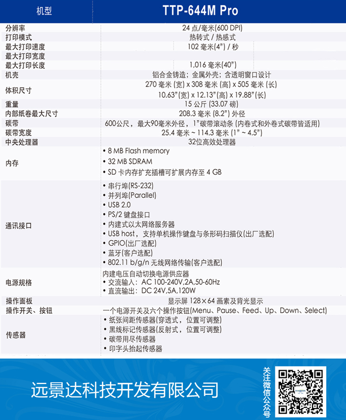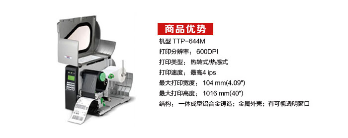 TSC TTP-644M(600DPI)工业级高清条码打印机,打印速度高达每秒12英吋,系同等级机种中最高速的条形码打印机。标准配备包含内部以太网络打印服务器、USB2.0和PS/2键盘 连接接口;内建内存规格为32 MB DRAM、8 MB FLASH和一个SD卡的内存扩充槽,使用者得以最经济的成本将内存容量扩充至4 GB。碳带容量最大长度可达600公尺;标签耗材最大外径208公分(8.2英吋)。一体成型的铝合金铸造机台,不论处理急迫性的大量打印或是单一批量打 印,TTP-644M 都能以绝佳的质量、效率及稳定度来完成您每一次的打印任务。