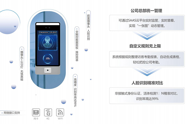 可通过网络连接,将访客数据与考勤数据上传到远景达物联网SAAS云平台进行统一管理。人脸设备支持对接智慧门禁考勤管理系统,通过配合通道闸机,可对进出门禁的人员授权和账户可进行统一管理,以及对统计数据的报表查看和审计,能够轻松实现门禁管理、访客登记和人员考勤等功能。