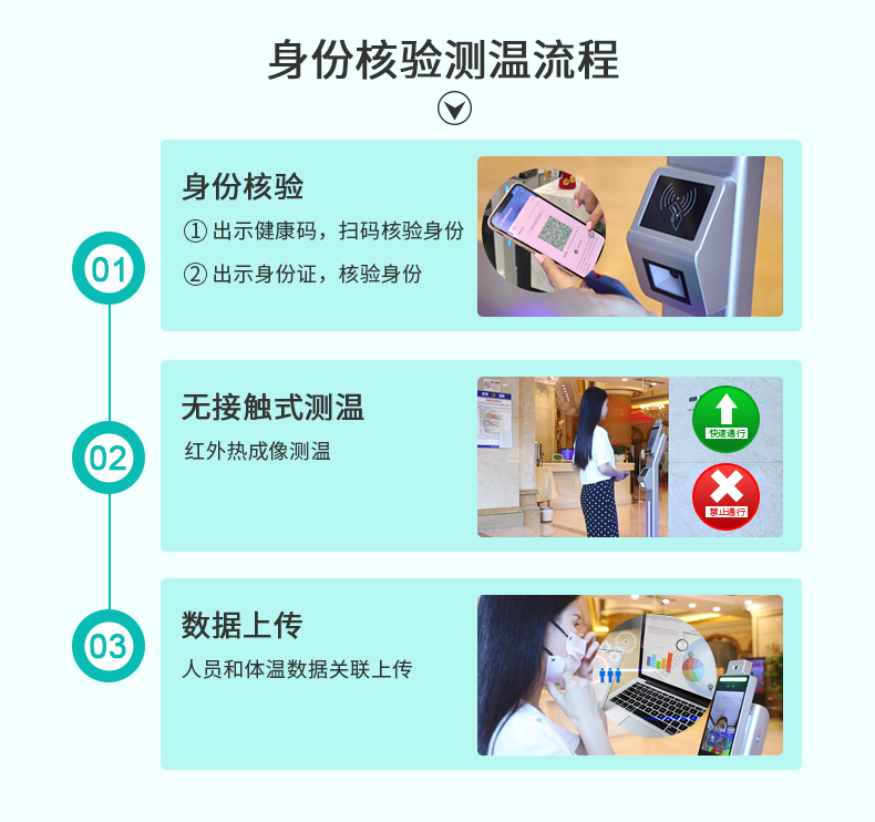 远景达智能红外测温人脸识别门禁一体机解决方案以人脸及体温为主要参照物,利用人脸识别技术和红外热成像体温检测技术进行身份认证,同时完成非接触式精准体温测量,快速筛查,可适用于疫情期间人流量较大且人群身份不固定的场所,如政务服务大厅、医护场所、街道社区、企业工厂、写字楼、校园、工地和景区等需要进行测温、考勤打卡或门禁管控的场所。