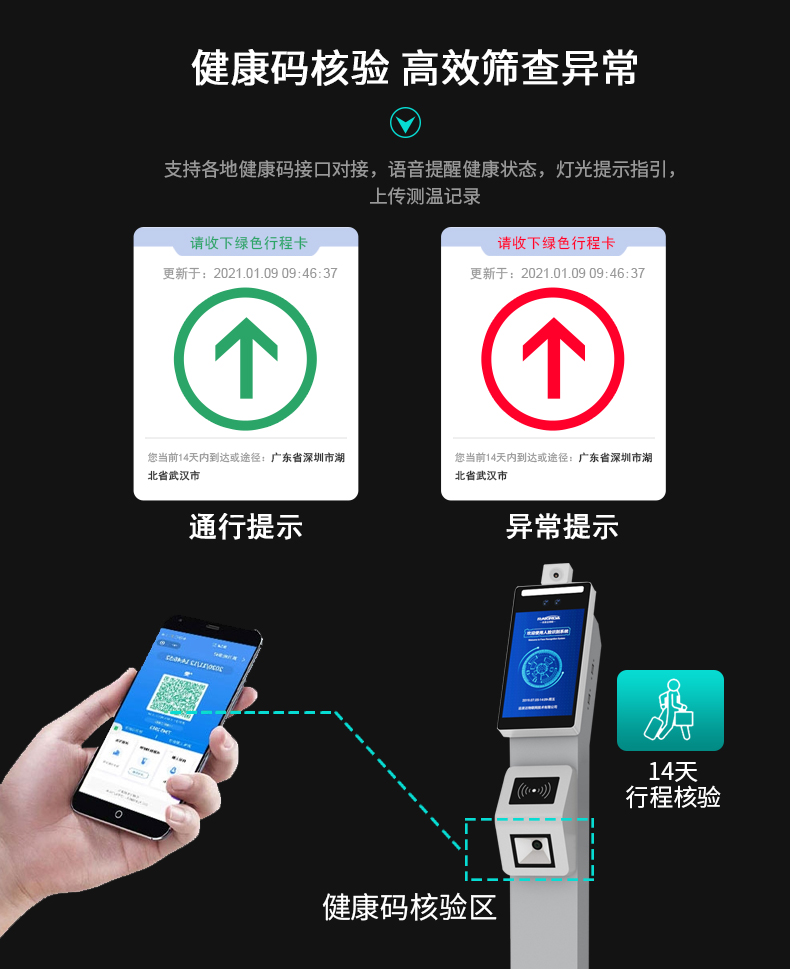 智能红外测温人脸识别一体机可通过内置的红外测温模块实现体温快速检测,可同时支持人证比对、体温检测、身份证读取、健康码识别验证(红绿码状态)、口罩检测等功能,并对体温异常人员进行预警,能够有效的保障防控安全。